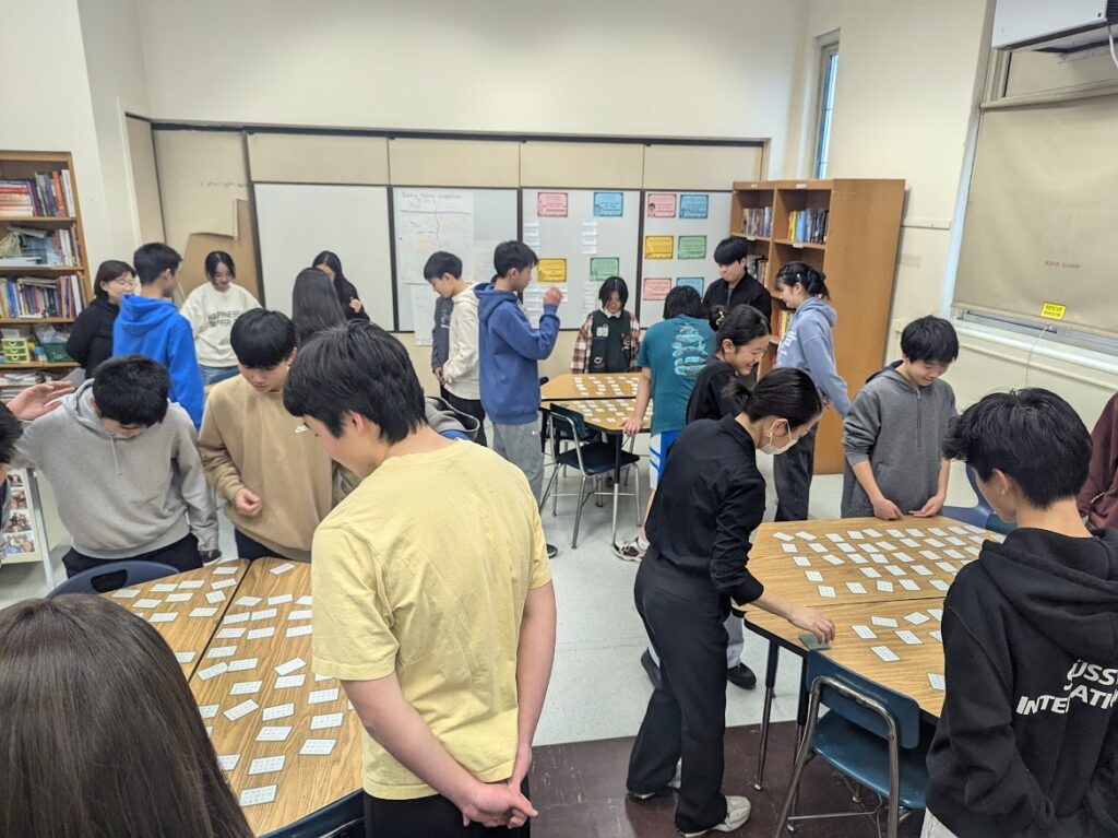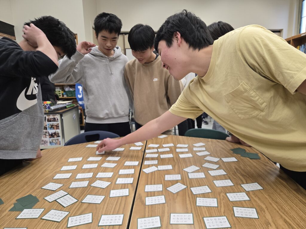 その後、百人一首大会が行われた。空気は一転し、会場には活気と緊張感が入り混じる。読み上げられる和歌に集中し、狙いを定めて札に手を伸ばす生徒たちの姿からは、これまで授業で和歌や百人一首のルールを学んできた成果を発揮する機会でもあり、真剣さが伝わってきた。後半になるにつれ、自分のグループの順位やポイントを気にして、試合は徐々に白熱していき、時には歓声や笑い声も交え、大会は大いに盛り上がった。「すごく楽しい」「またやりたい」と楽しい学びの時間になった。