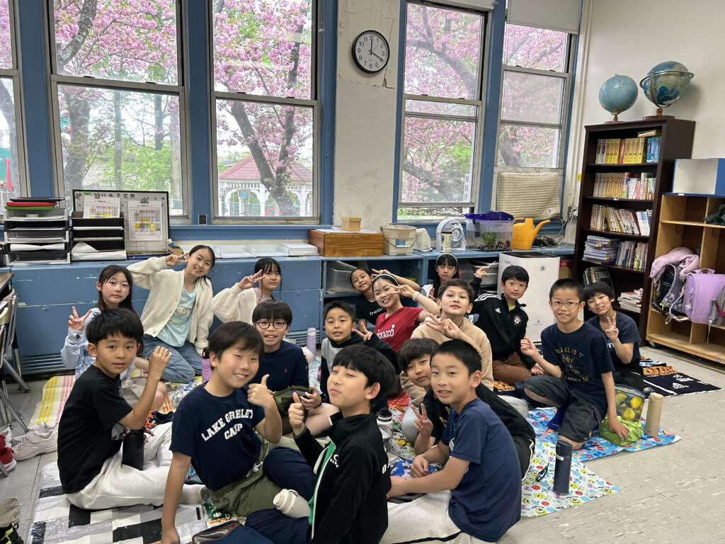 窓いっぱいに広がる桜を眺めながら、低学年から高学年までが一緒に昼食を楽しむ時間は、普段の学年別の授業とは異なる交流の場となった。「レジャーシート広げてお花見って、外国ではあまりみないね」「お花見するのって日本人だけなの?」と日本と海外の違いに目を向けた会話が自然と生まれていた。